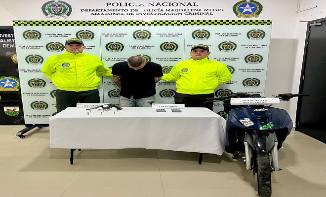 Personal la Seccional de Investigación Criminal del Departamento de Policía Magdalena Medio, en la lucha frontal contra el delito en todas sus modalidades, mediante diligencia de registro y allanamiento logró la captura en flagrancia de un sujeto conocido en el mundo criminal como “Moisés” de 31 años de edad a quien se le incautó un arma de fuego tipo revólver calibre 38 con 6 cartuchos para el mismo.