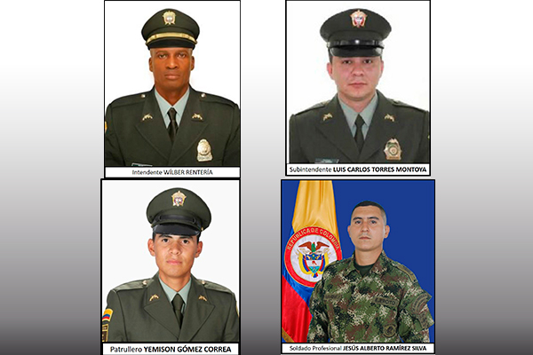 2. Los uniformados, tres policías y un militar, que a esta hora se encuentran privados de la libertad son: el intendente Wilber Rentería, el subintendente Luis Carlos Torres Montoya, el patrullero Yemison Leandro Gómez Correa y el soldado profesional Jesús Alberto Ramírez Silva.