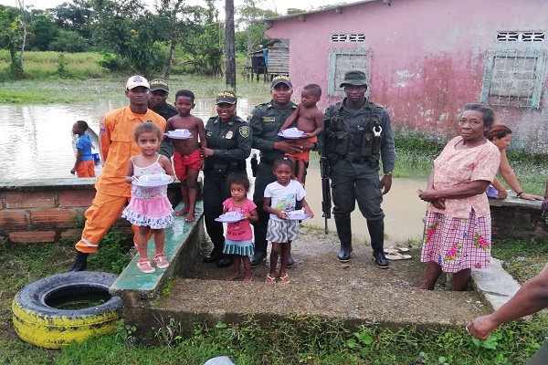 En desarrollo del Plan de Choque “navidad segura, más cerca del ciudadano” nuestros uniformados de Educación y Prevención ciudadana y Escuadrón Móvil de Carabineros adscritos al Departamento de Policía Chocó, visitaron el corregimiento de Guayabal, con el objetivo de brindar apoyo a los habitantes de ese municipio quienes fueron afectados por las inundaciones a raíz de la ola invernal que afronta el departamento del Chocó