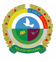 Creado mediante la resolución 6710 del 14 de agosto de 1980, el escudo tiene una forma redonda, (hispano árabe), cuartelado en perla de plata disminuida, lleva por eje un campo azur una paloma pasante, en plata, picada y membrada en gules, que tiene por ojo un tortillo en azur y porta en el pico un gajo de olivo con ocho hojas nervadas en sable. El cuartel siniestro es sinople, ostenta un libro en oro, cubierto, con once regiones en sable, el diestro en púrpura, blasona una lámpara encendida en plata con llama de oro. Al escudo lo rodea arriba medio circulo en oro con el timbre en sable: “ESCUELA DE POLICIA SIMON BOLIVAR” y otro medio circulo abajo en plata, con la divisa en gules: “ESTUDIAMOS PARA SERVIR”. El círculo representa la perfección infinita: Dios. La plata es metal noble en heráldica y simboliza integridad, sinceridad, obediencia, firmeza, vigilancia, elocuencia y vencimiento, virtudes raras pero necesarias y que conforman todo un programa para nuestros estudiantes de policía. El gules es fortaleza, victoria, osadía, alteza. La policía acoge todas las virtudes de sus hombres para llevar la paz, compañera y generadora del orden y progreso patrio. El sinople es nuestro color institucional, como blasón es fe, amistad, esperanza, servicio y respeto. El gules en la heráldica de metal noble, es nobleza, magnanimidad, riqueza; toda nuestra riqueza espiritual y material está consagrada a la defensa de la ley. El púrpura indica grandeza y sabiduría, podría decirse que la grandeza de un pueblo se mide por la importancia de la policía.