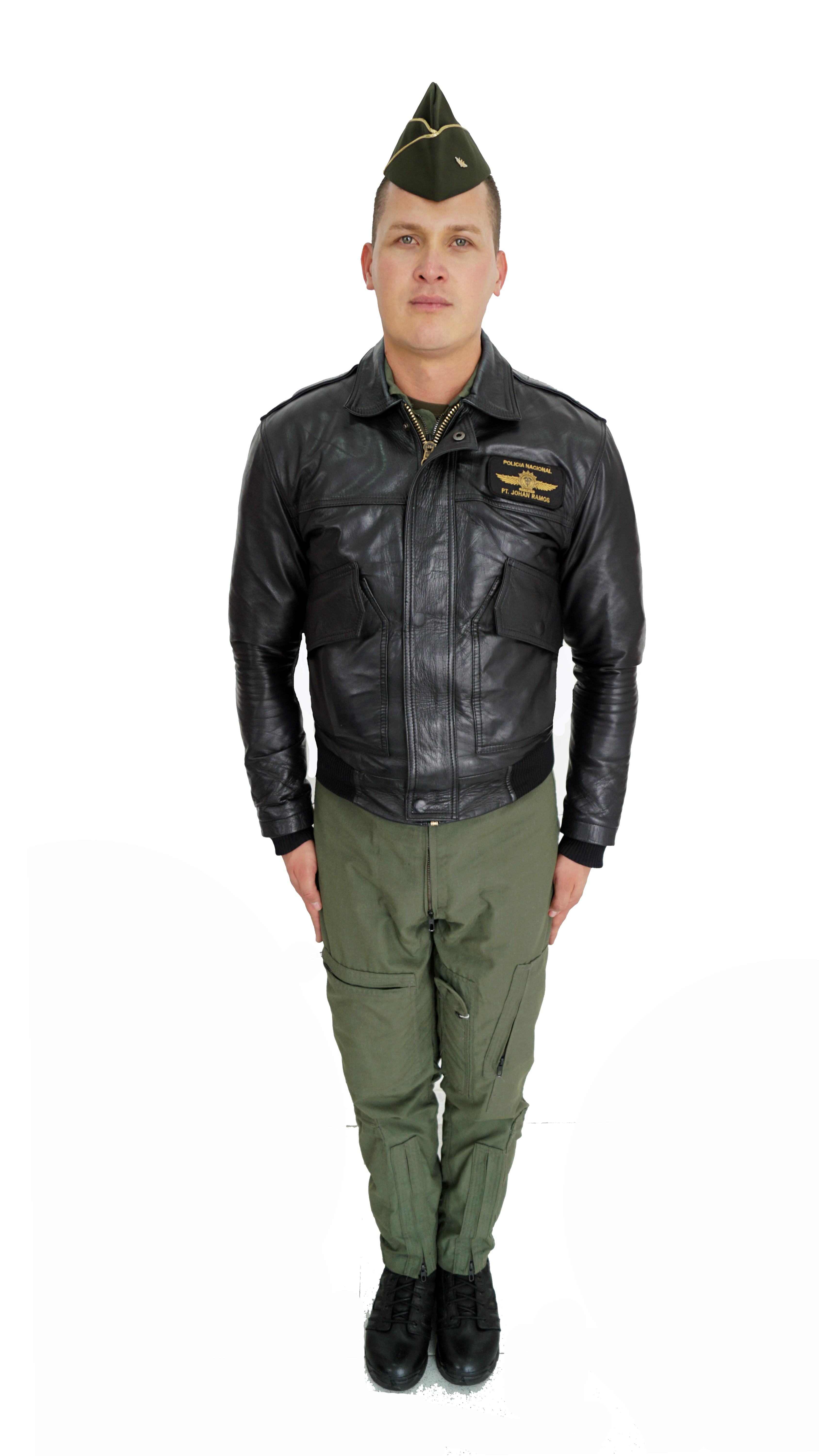 Se caracteriza por ser una chaqueta en cuero de color negro brillante, esta cuenta con dos bolsillos frontales, cremallera central y un espacio en velcro en el lado izquierdo para el uso del tarjetero. Para el caso de los señores oficiales, se deberá portar los distintivos de grado en los hombros de modo que sean visibles para su correcta identificación.