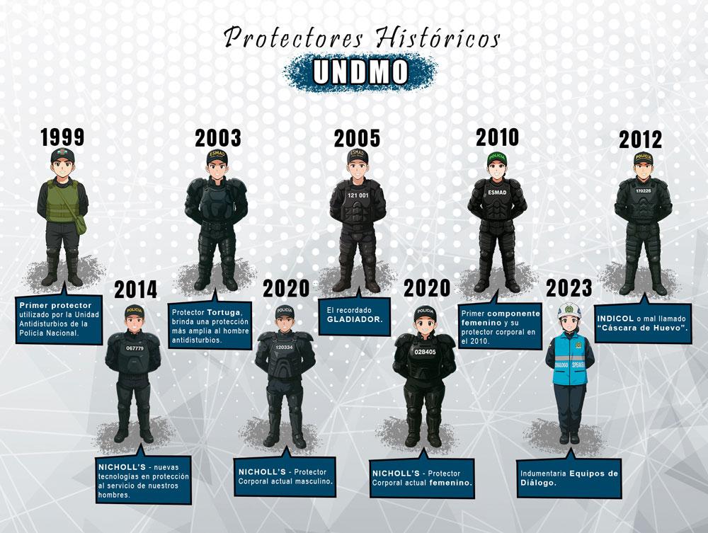 Protector personal: Está diseñado en POLIAMIDA INYECTADO el cual es un termoplástico con estructura semi-cristalina muy dúctil y duro. Es un material de bajo peso con gran resistencia a la deformación térmica (resistente a temperaturas de -40°c aprox. Y más de 100°c). Su diseño anatómico facilita la movilidad al uniformado brindándole comodidad. Reduce considerablemente el número de lesionados en procedimientos.