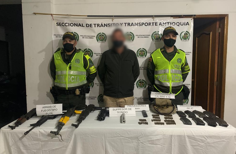 Los hechos se presentaron en el eje vial Hatillo hacia los Llanos de Cuivá, cuando uniformados de tránsito y transporte adscritos al Departamento de Policía Antioquia mediante actividades de registro y control solicitaron a un sujeto descender de una camioneta en el que se transportaba, hallando en el interior de la misma tres fusiles, una UZI, 1 fusil M-16, 715 cartuchos de diferentes calibres, 1 supresor de sonido, 5 proveedores para fusil Ak 47, 3 proveedores para fusil 5.56 y 1 proveedor de pistola 9mm.