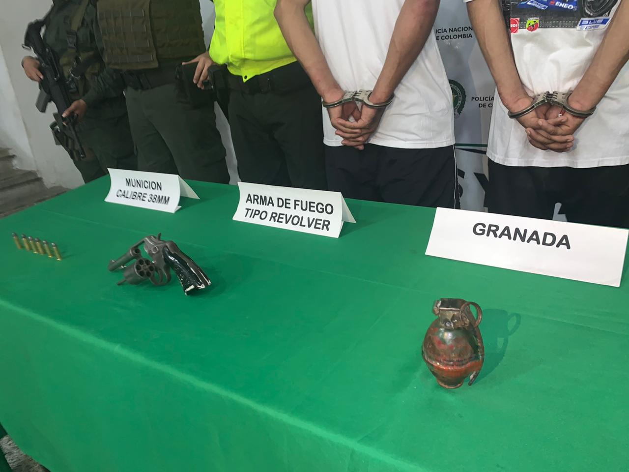 En el desarrollo de la estrategia de seguridad y convivencia ciudadana para contrarrestar el delito de homicidio y hurto en el Magdalena Medio, el día de ayer en vía pública del barrio Oasis de Puerto Berrio (Antioquia) mediante labores de registro y control y gracias a nuestra Red de Participación Cívica logramos la captura de “Peluche” de 34 años de edad y “Duvian” de 31 años quienes al realizarle un registro se le halla en su poder un arma de fuego tipo revolver calibre 38 con seis cartuchos para el mismo y una granada de fragmentación.