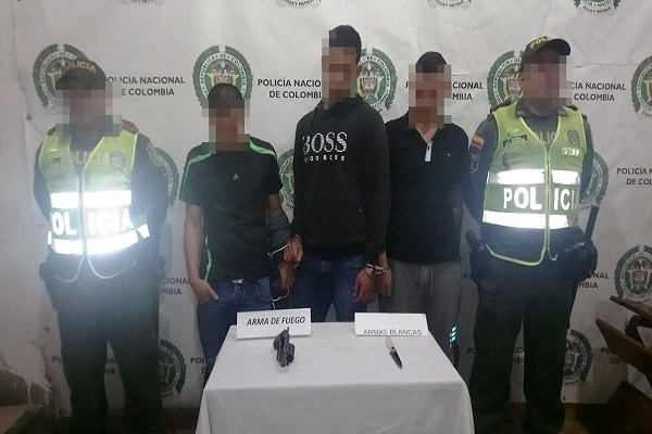 Los hoy capturados de 31, 27 y 19 años de edad, este último de ciudadanía Venezuela, les fueron hallados al interior del vehículo en el que se movilizaban un revolver (traumática) y un arma corto punzante (cuchillo), elementos con que intimidaron a los empleados del establecimiento comercial, así mismo, se pudo establecer que el líder de este grupo delincuencial conocido delincuencialmente como “Triviño” registra antecedentes por los delitos de homicidio, hurto, porte ilegal de armas de fuego y fuga de presos, actualmente posee beneficio de detención domiciliaria en su residencia ubicada en el municipio de Dosquebradas y le fue hallado en una de sus piernas el respectivo brazalete instalado por el INPEC.