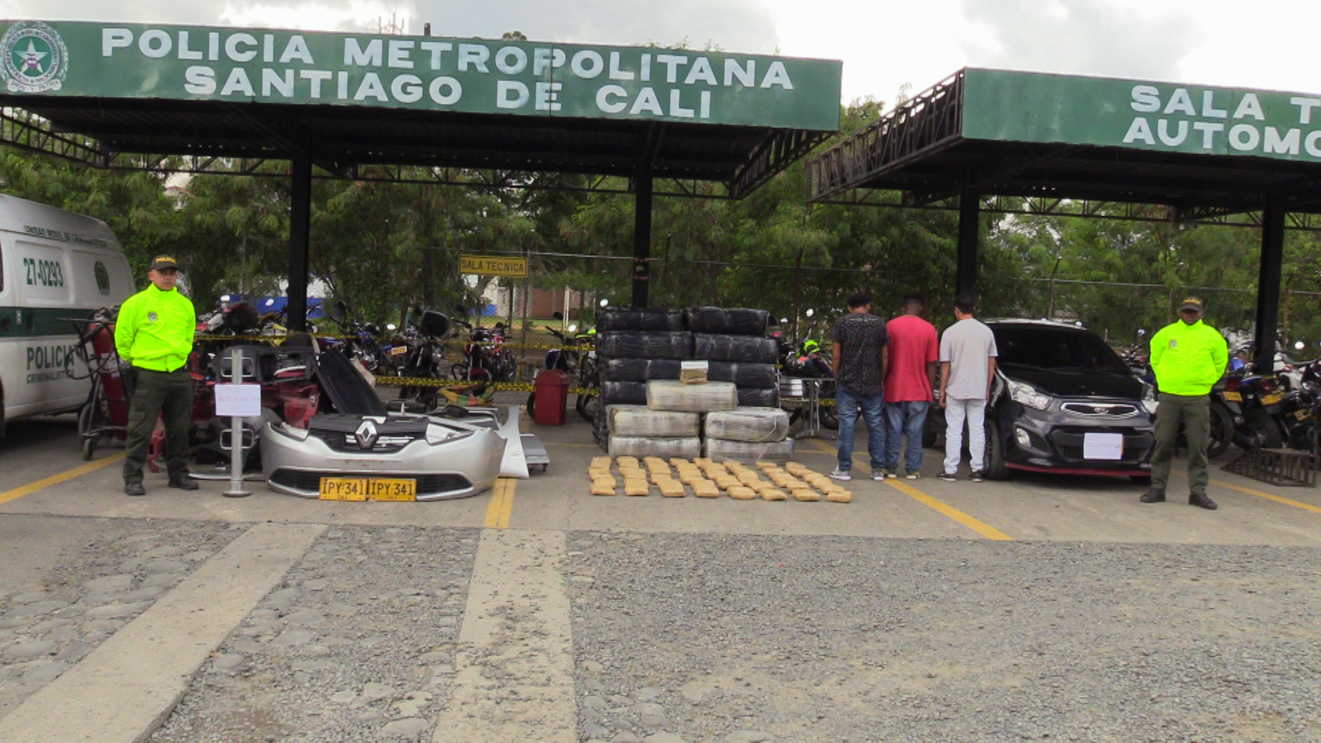 En el lugar fueron halladas gran cantidad de autopartes, herramientas, maquinaria y equipo para desguazar los vehículos. También se logró la recuperación de tres vehículos hurtados en proceso de desguace, la incautación una tonelada de marihuana prensada y la captura de tres personas fueron dejadas a disposición de la Fiscalía 99 URI por los delitos de Receptación y tráfico, porte y fabricación de estupefacientes.