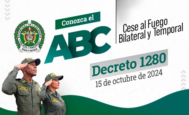 La Unidad Policial para la Edificación de la Paz, invita a conocer el Decreto 1280 del 15 de octubre del 2024, el cual establece los lineamientos de la “Prorroga del Cese al Fuego Bilateral y Temporal con Respeto a la Población Civil, entre el Gobierno Nacional y el autodenominado Estado Mayor de los Bloques Magdalena Medio, Comandante Gentil Duarte, Comandante Jorge Suárez Briceño y Frente Raúl Reyes FARC-EP”, a partir de las 00:00 horas del día 16 de octubre del 2024 y hasta las 24:00 horas del 15 de abril del 2025.
