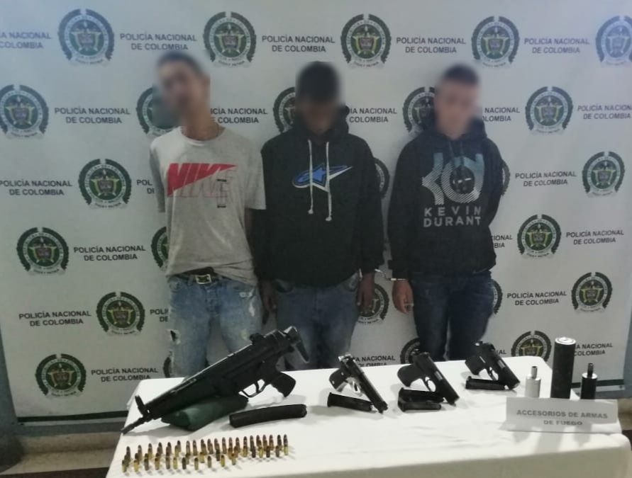 Esta acción desencadenó una persecución policial que, momentos después, permitió realizar las capturas e inmovilizar un vehículo taxi que figuraba como robado. En el procedimiento se logró la incautación de cuatro armas de fuego. Según la investigación, estos sujetos al parecer pretendían atentar contra integrantes de ‘Los Pachelly’, grupo delincuencial con el cual mantienen una confrontación en el municipio de Bello por el control de actividades criminales.