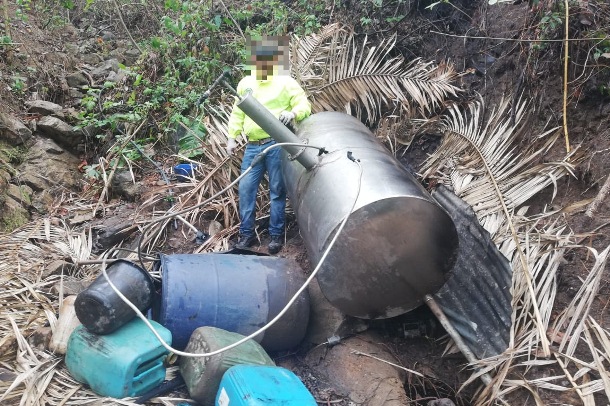 Al llegar a este lugar el cual estaba dedicado al procesamiento de droga se encuentran 12 canecas de acetona de nueve galones cada una, seis canecas de 55 galones de tiner, dos hornos microondas, dos prensas hidráulicas, una gramera digital, una pesa tipo reloj, seis tubos de ensayo, una empacadora al vacío, un escurridero de madera y malla plástica de 4 cavidades, un compresor de aire, treinta canecas plásticas vacías de diferentes tamaños y 1.703 gramos de base de cocaína, todo estos elementos avaluados en 57 millones de pesos.