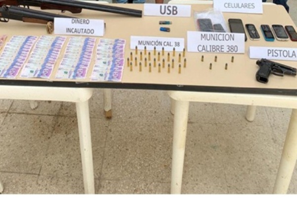 Este contundente operativo deja la incautación de un arma de fuego tipo pistola, marca Prieto Beretta, con nueve cartuchos para pistola calibre 3.80, con proveedor, 30 cartuchos para pistola calibre 38, dos armas de fuego tipo escopeta calibre 12 y 16 ambas doble cañón, siete celulares de diferentes marcas, dos USB y 2 millones 950 mil pesos en dinero incautado.