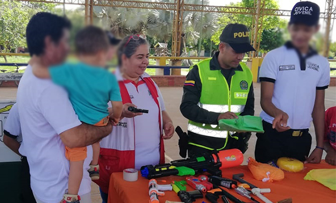 Los uniformados del grupo de Prevención y Educación Ciudadana, recepcionaron 385 juguetes bélicos y 27 armas blancas, y a cambio los jóvenes recibieron kits escolares, elementos deportivos, refrigerios o pollitos, que se les entregaron por su compromiso en la construcción de una ‘Democracia Segura’.