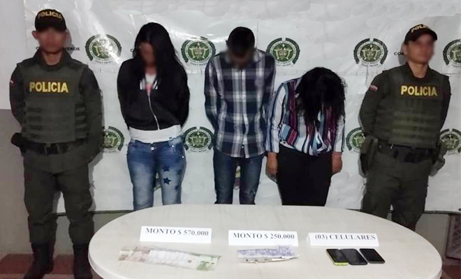 Se trata de tres presuntos delincuentes conocidos en el mundo del delito como ‘Jenny’, ‘Carmen’ y ‘Andrés’, residentes en los barrios Brisas del Guatiquía, Jordán y Villa Juliana de Villavicencio, quienes se acababan de hurtar 820 mil pesos en efectivo de dos viviendas ubicadas en el barrio Gaitán del municipio de Puerto Lleras, los cuales fueron recuperados al ser encontrados escondidos entre sus partes íntimas. Así mismo, fue vinculado al proceso un hombre que, de acuerdo a lo señalado por la comunidad, daba aviso a sus cómplices sobre la presencia policial, sin embargo; gracias a la efectiva intervención fue frustrado el acto delictivo.