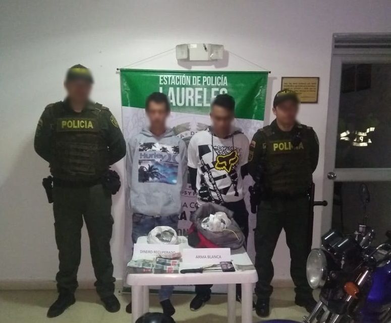 Los capturados de 26 y 28 años de edad, junto con las armas blancas, el dinero recuperado y la motocicleta inmovilizada fueron dejados a disposición de la Fiscalía General de la Nación.