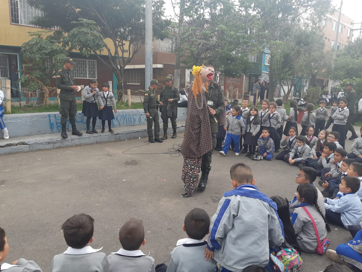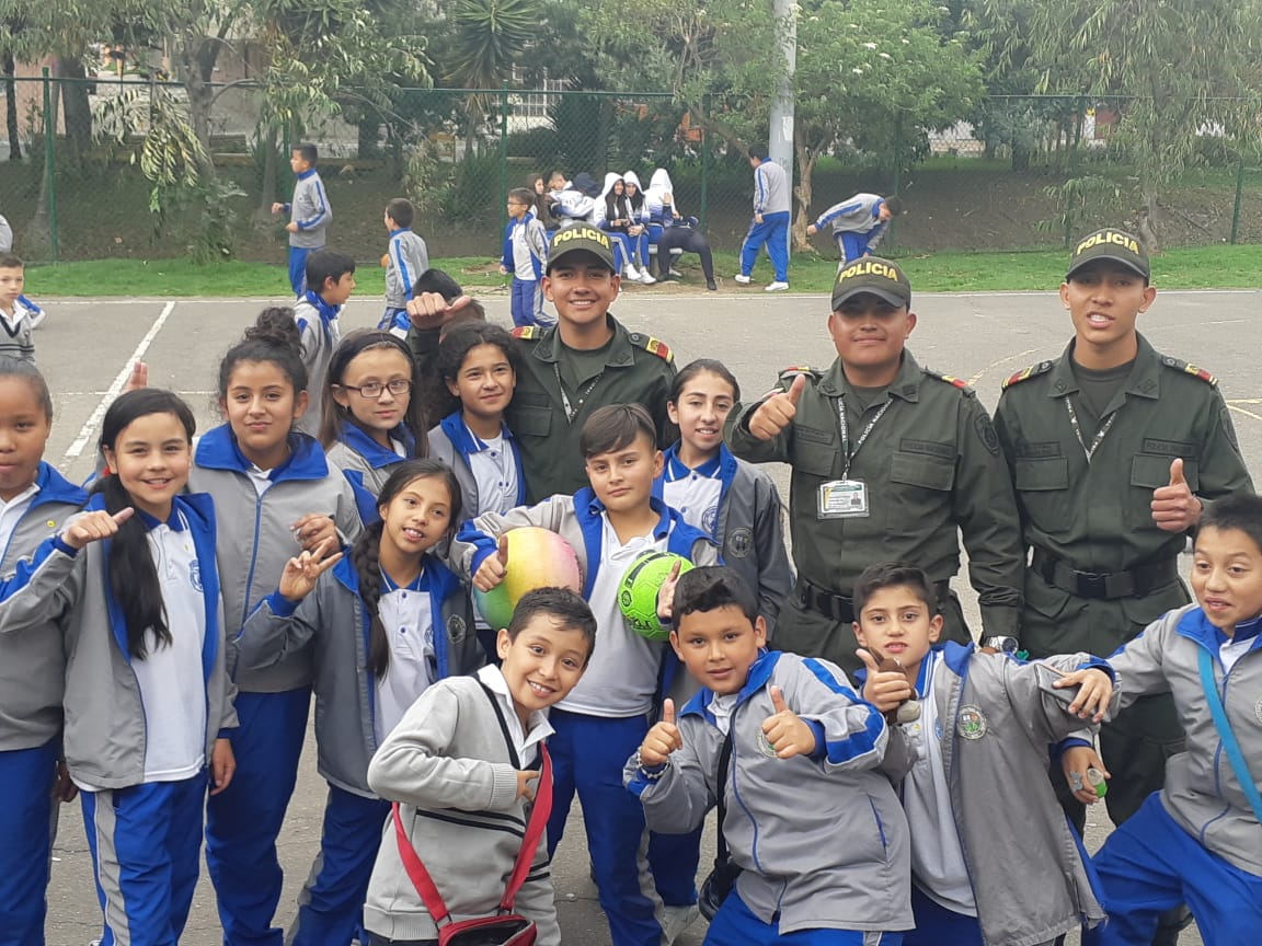 Mediante el acompañamiento a los colegios de la localidad de Tunjuelito el grupo de Proyección Social de la Escuela de Policía Metropolitana de Bogotá celebro el día de los dulces en el colegio Cooperativo Nuevo Muzú Ubicado en la Carrera 59 # 51b – 46 sur, con la integración de 250 niños, niñas y adolescentes de este plantel educativo.