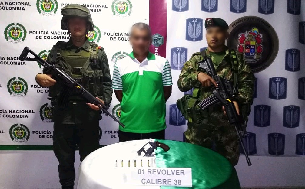 Las labores de vigilancia y control realizadas de manera conjunta con tropas del Ejército permitieron obtener la captura de este hombre que al practicarle un registro personal se le halló un arma de fuego con munición para la misma. Inmediatamente fue trasladado hasta las instalaciones de la Unidad de Reacción Inmediata URI con el fin de ser dejado a disposición de la Fiscalía por el delito de fabricación, tráfico y porte de armas de fuego y municiones.