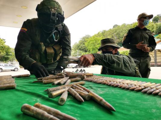 Una vez confirmadas las coordenadas, un dispositivo policial conformado por Comandos Jungla, y personal del Escuadrón Móvil de Carabineros, ejecutaron un operativo en zona rural (vereda Pan de Azúcar) del municipio del Zulia, Norte de Santander, hallando en una caleta bajo tierra, 905 cartuchos calibre .50 mm.