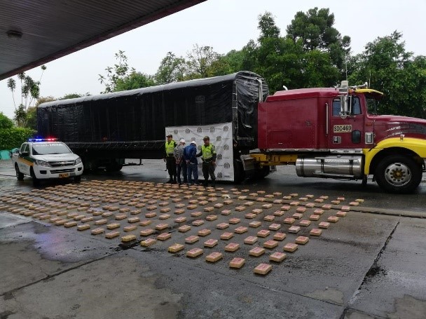 En una segunda acción operativa en vías del Quindío, mediante puestos integrales de prevención y control, en las últimas horas en el eje vial La Paila-Armenia, exactamente en el kilómetro 31+200 lograron la captura de dos personas, el vehículo cubría la ruta Puerto Tejada – Maicao, quienes transportaban bienestarina, y se les halla en la modalidad tipo caleta en el remolque un doble piso 285 paquetes de forma rectangular en cinta color café, presentando una etiqueta con las letras “rr” en color negro cada paquete, arrojando un peso de 337 kilogramos de “Clorhidrato de Cocaína”, caso el cual es dejado a disposición de la Fiscalía Especializada de Armenia. Mercancía avaluada en 1.696 millones de pesos.