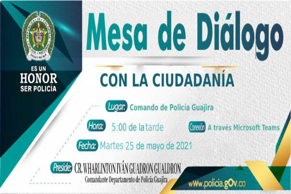 Se complace en invitar a la “Mesa de Diálogo sobre la Gestión del Comando de Policía Guajira con enfoque en Derechos Humanos y Paz” a los integrantes de las juntas de acción comunal, gremios, redes de participación cívica y comunidad en general. Acto que se realizará el día 25 de mayo del 2021, a las cinco de la tarde en la sala de juntas del Comando de Policía Guajira, Barrio Camilo Torres, de forma virtual.