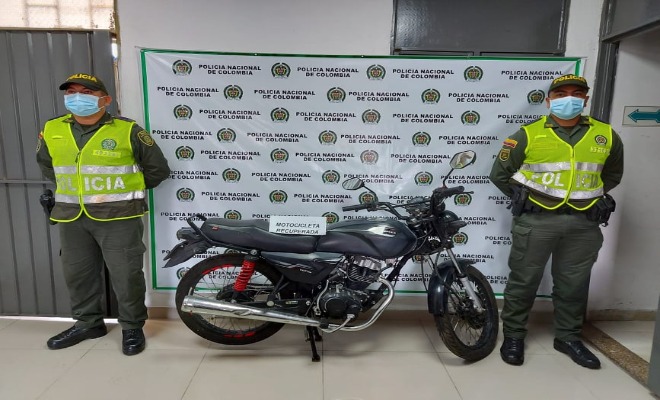 Un segundo caso se presentó en vía pública del Corregimiento del Convenio, lugar donde personal del cuadrante se encontraba realizando planes y controles diferenciales quienes lograron la recuperación de una motocicleta de mediano cilindraje color negro mate, avaluada en cerca de $4.000.000, donde al momento de solicitarle antecedentes, se logró evidenciar que figuraba como requerida por Fiscalía seccional 129 de la ciudad de Bogotá, donde figura denuncio por el delito de hurto, al parecer en hechos presentados en el año 2019.