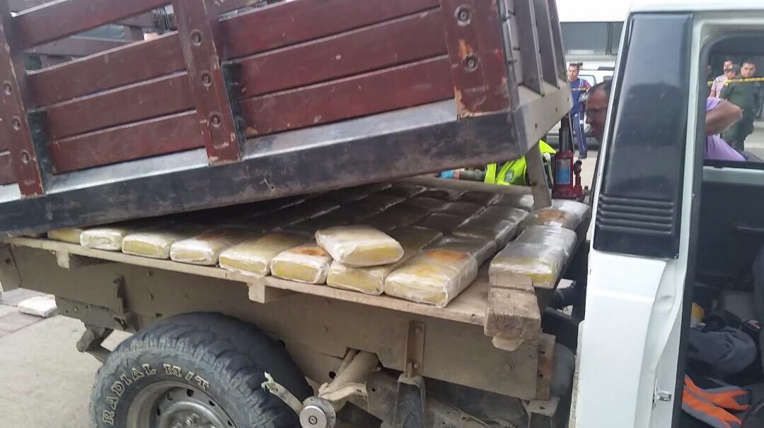 Este hecho despertó sospechas en los efectivos policiales, que al indagarle al conductor del vehículo, este cambio el semblante y se tornó nervioso ante las preguntas realizadas; los funcionarios de Tránsito y Transporte realizaron una inspección minuciosa al vehículo encontrando que el piso de la carga de la carrocería, presentaba una caleta comúnmente conocida como “Doble Piso” en la cual se hallaron 100 paquetes de color beige encintados.