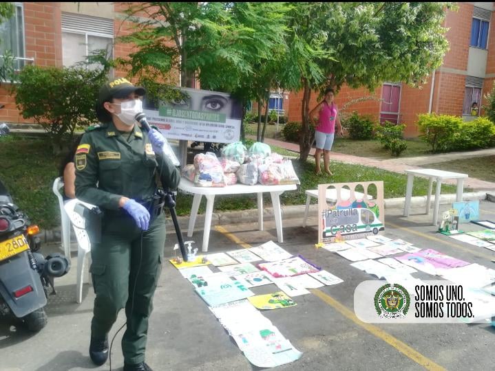 <p class="rtejustify"> Mediante perifoneo y entrega de volates se invitó a la comunidad en especial a los niños niñas y adolescentes a participar de un concurso de dibujo orientado a la motivación para el personal de la salud, así como para la Policía Nacional, entre otros quienes diariamente estas luchando contra la propagación del virus, así mismo, se tenía que plasmar un escrito sobre la importancia de quedarse en casa y la prevención de la violencia en los hogares colombianos a través del programa ‘patrulla en casa’.</p>