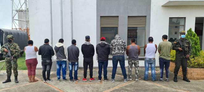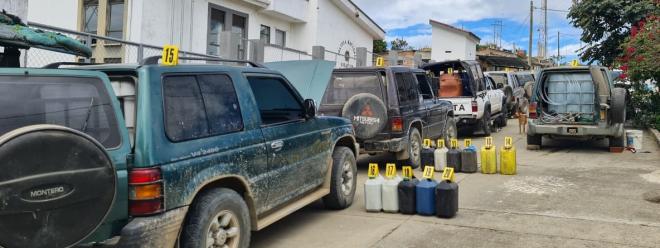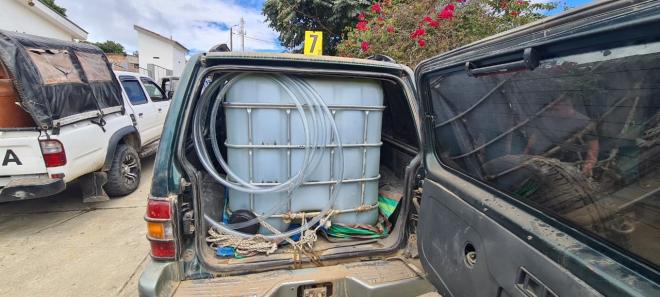 En el sector de Puente Remolino, municipio El Rosario, fueron capturadas diez personas quienes se movilizaban en cinco vehículos tipo campero y una camioneta, trasladando en su interior tanques de gran almacenamiento de líquidos y bidones plásticos de cinco galones que contenían combustible.