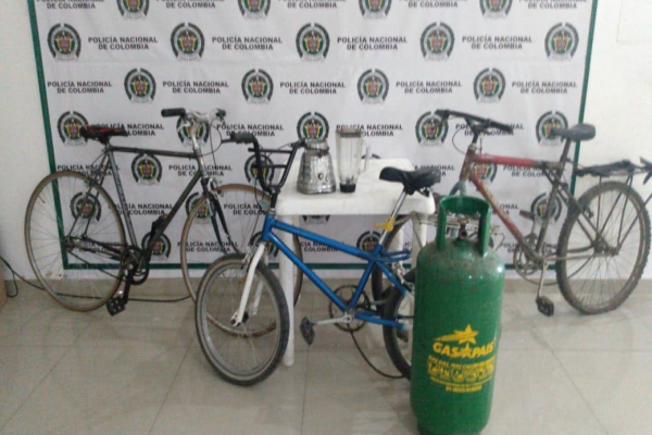 Buscando a los sujetos donde debajo de una mesa se logran la captura en flagrancia de dos hombres de 23 y 27 años a quienes se les hallo en su poder una licuadora y un cilindro de gas color verde listos para ser sacados del lugar, así mismo continuando con la búsqueda de elementos a las afueras del inmueble se hallaron tres bicicletas de color rojo, gris y azul con blanco, las cuales minutos antes habían sido sacadas.