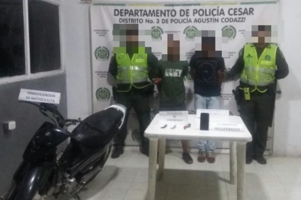 Un ciudadano transitaba por las calles de Codazzi, cuando dos personas que se movilizaban en una motocicleta lo interceptan y tras intimidarlo con armas blancas, lo despojan de su celular de alta gama. De manera inmediata, y gracias a la información de la comunidad, las patrullas del cuadrante reaccionan y a pocas cuadras logran interceptar a estos sujetos.